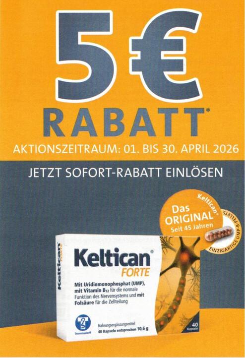 Beim Kauf einer Packung Keltican forte 40 Stück (PZN 01712263) erhalten Sie einen Sofort-Rabatt in Höhe von 5€ direkt an der Kasse.