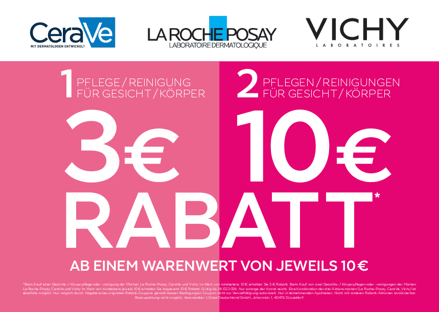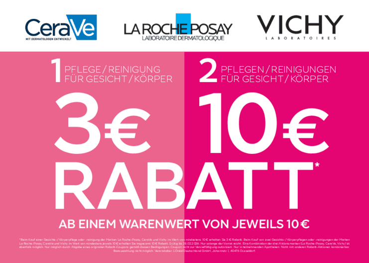 Beim Kauf einer Gesichtspflege oder Reinigung der Marken La Roche Posay, CeraVe und Vichy im Wert von mindestens 10€ erhalten Sie 3€ Rabatt. Beim Kauf von zwei Gesichtspflegen oder Reinigungen im Wert von mindestens jeweils 10€ erhalten Sie insgesamt 10€ Rabatt.